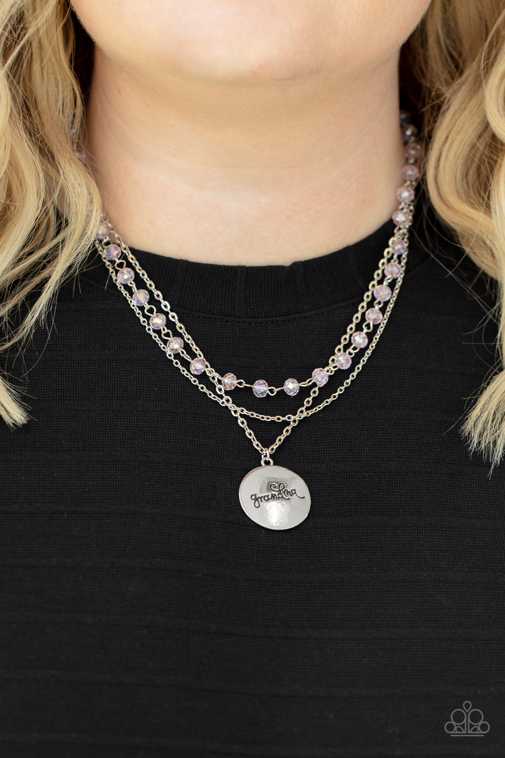 Infused with a strand of iridescent pink crystal-like beads, two dainty rows of mismatched silver chains delicately layer below the collar. Stamped in the word, "Grandma," a shiny silver disc swings from the lowest chain, creating a loving pendant. Features an adjustable clasp closure.