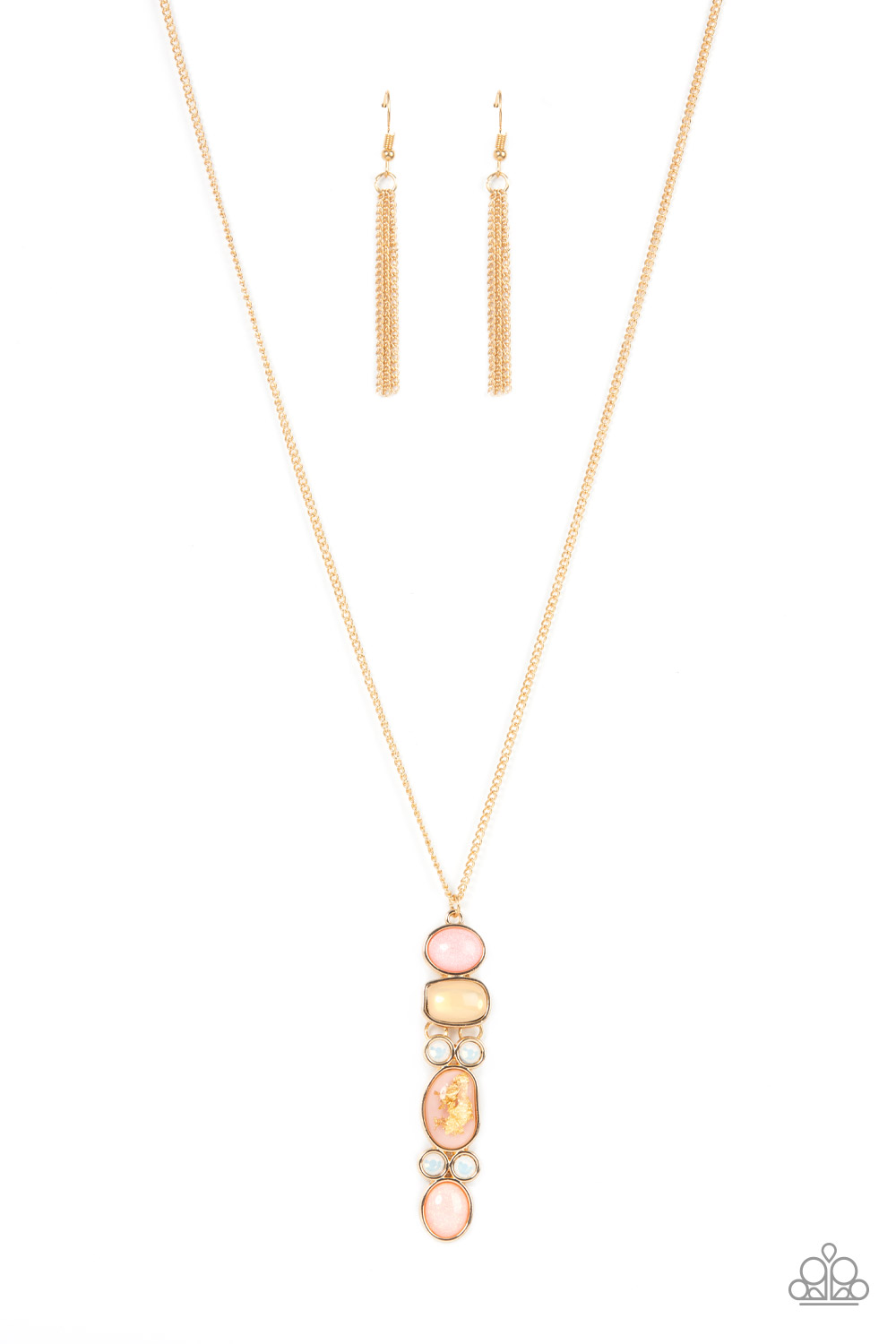 A glassy display of sparkly, glassy, and gold flecked golden and pink beads and pairs of glitzy opalescent rhinestones delicately stacks into an ethereal pendant at the bottom of a gold chain. Features an adjustable clasp closure.