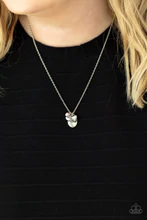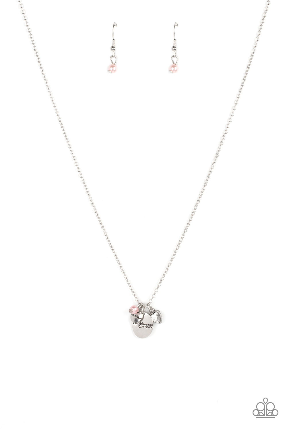 A whimsical charm collection including, a pink pearl, glittery rhinestone heart, a dainty silver disc stamped in the word, "Mom," and a silver pendant stamped in the motivational phrase, "Do all things with love," delicately glide along a dainty silver chain below the collar for an endearing fashion. Features an adjustable clasp closure.