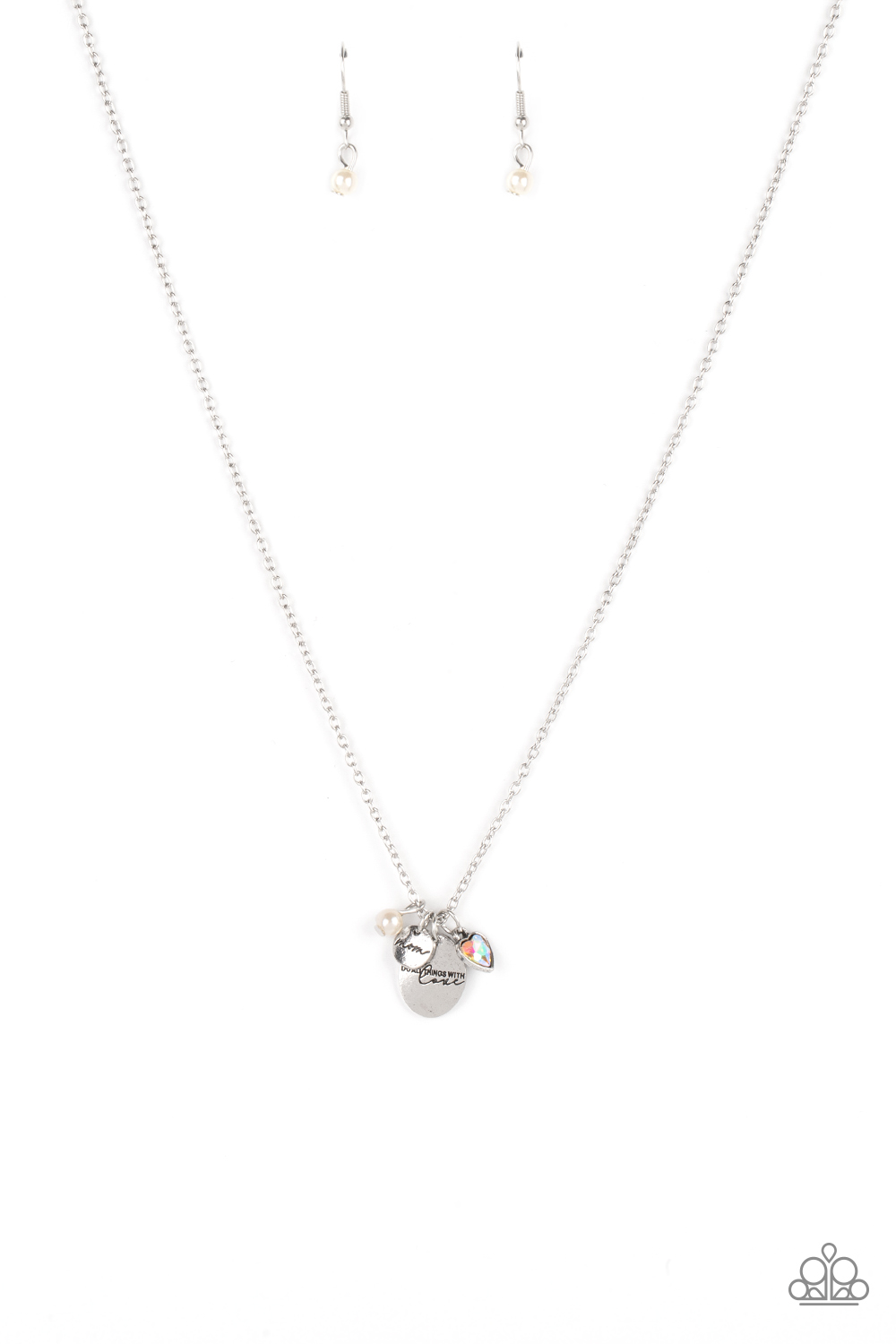 A whimsical charm collection including, a white pearl, iridescent rhinestone heart, a dainty silver disc stamped in the word, "Mom," and a silver pendant stamped in the motivational phrase, "Do all things with love," delicately glide along a dainty silver chain below the collar for an endearing fashion. Features an adjustable clasp closure.