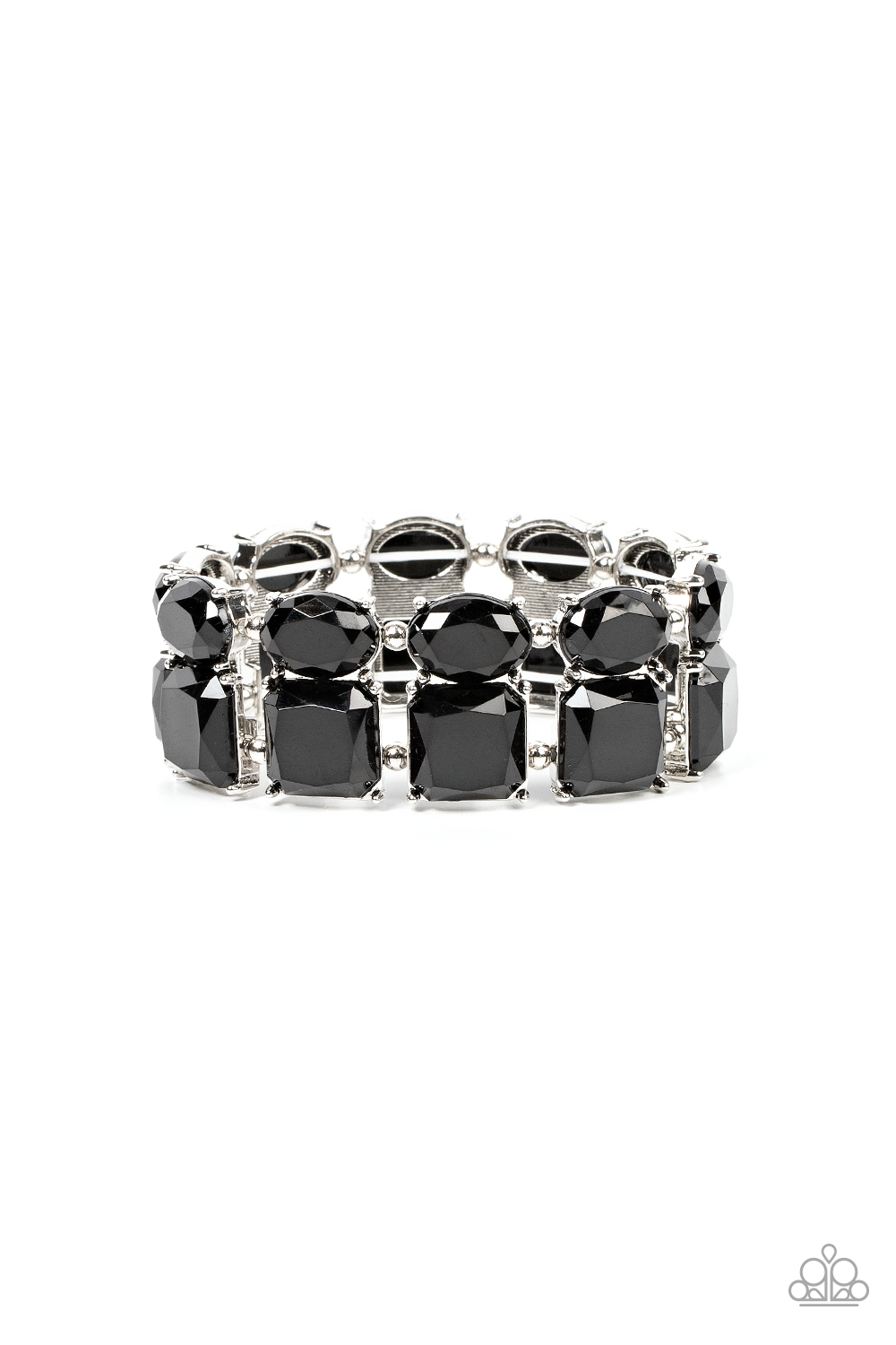 Separated by pairs of dainty silver beads, faceted stacks of oval and square cut black beads are threaded along a stretchy band around the wrist for a bold pop of color.