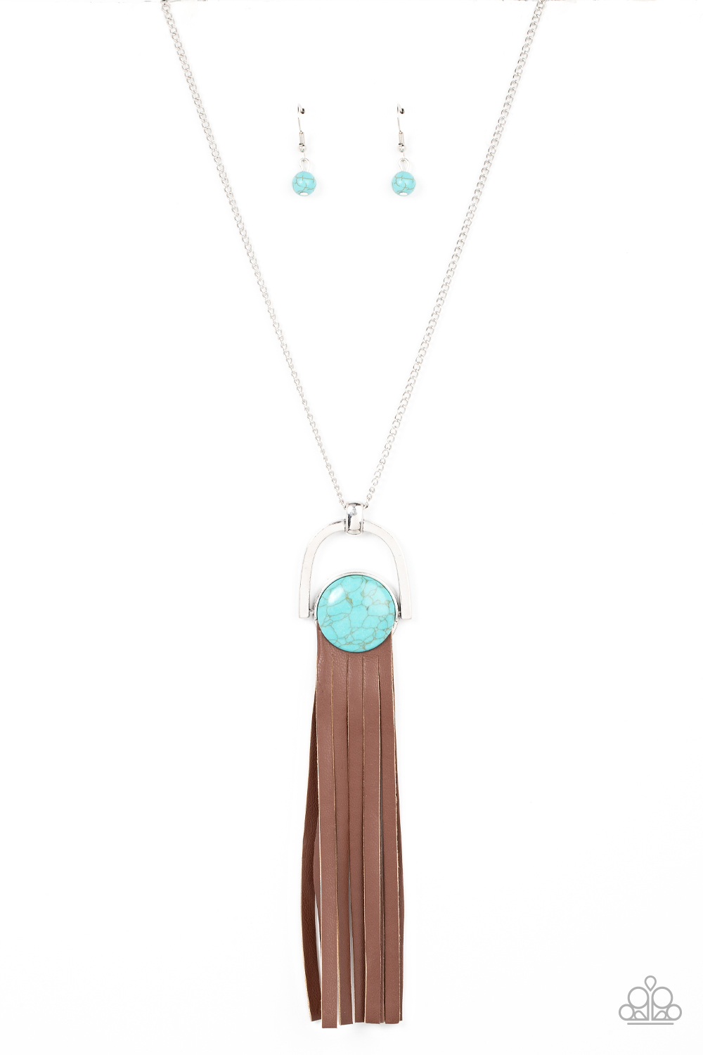 Strips of brown leather fan out from the bottom of a round turquoise stone that is threaded along a metal rod that attaches to the bottom of a silver horseshoe frame. The earthy pendant swings from the bottom of an extended silver chain, resulting in a wildly wonderful tassel. Features an adjustable clasp closure.