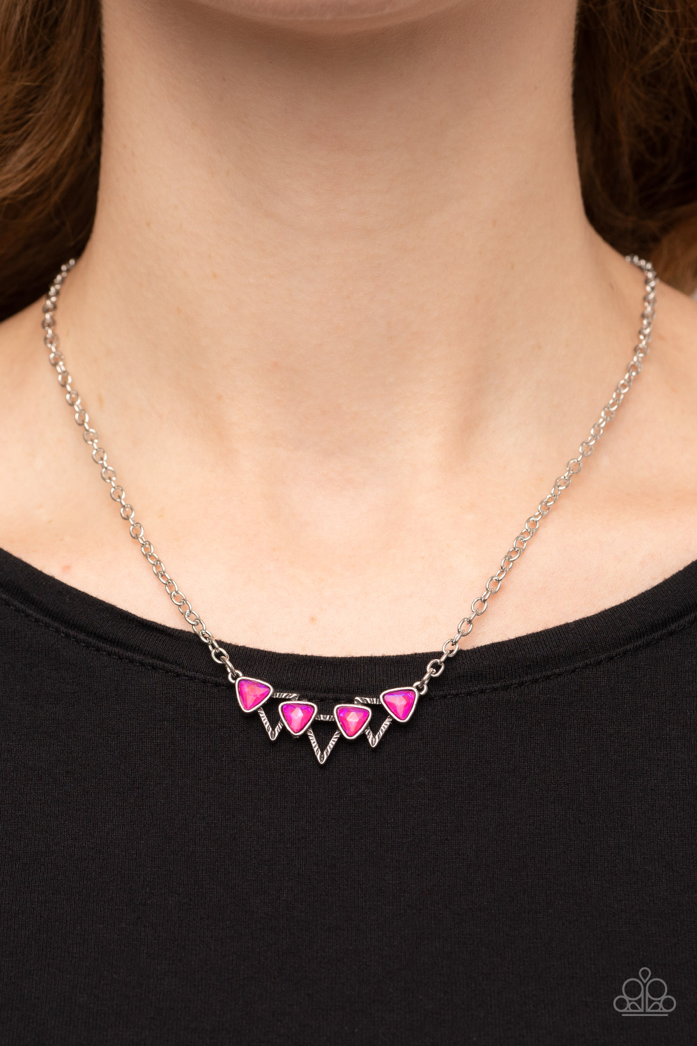 A staggered row of iridescent pink triangular gems stack across the front of a row of textured silver triangular frames, resulting in a stellar sparkle below the collar. Features an adjustable clasp closure.