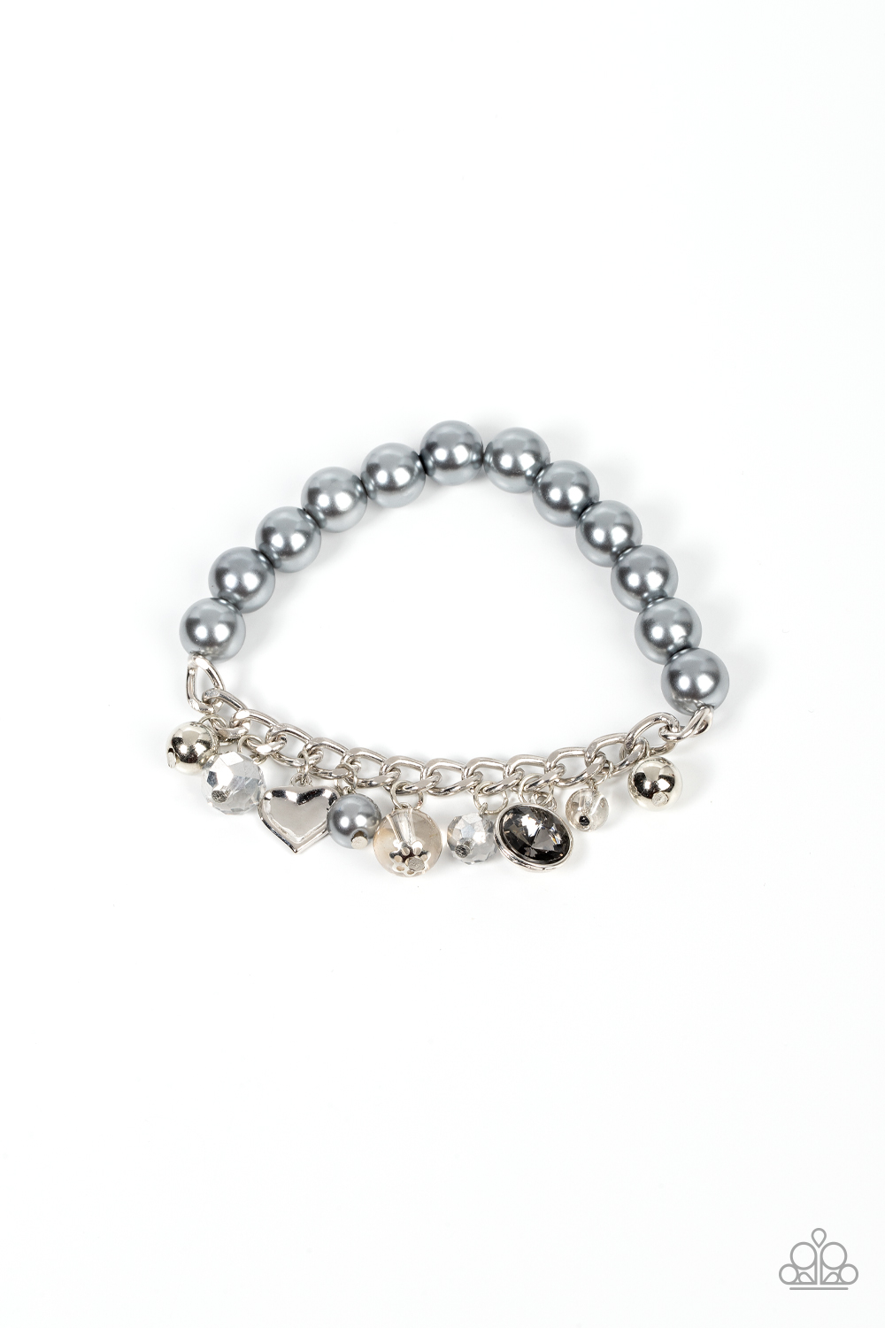 Mismatched silver beads, pearls, crystal-like accents, gems and heart charms dance from a section of silver chain that attaches to a stretchy band of silver pearls around the wrist for a flirtatious sparkle.