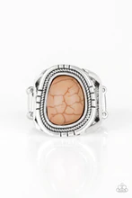 An earthy brown stone is pressed into an asymmetrical silver frame radiating with tactile textures for a seasonal look. Features a stretchy band for a flexible fit.