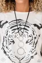 Gradually increasing in size, two hematite rhinestone encrusted hoops link with a smooth silver hoop down the chest. The airy stacked pendant slides along a black leather cord for a fierce and edgy finish. Features an adjustable clasp closure.