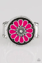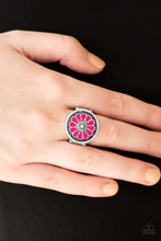 Brushed in an antiqued shimmer, vivacious pink petals spin into a whimsical floral pattern atop the finger. Features a stretchy band for a flexible fit. Sold as one individual ring.