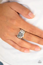 A trio of flowers bloom from the center of a thick silver band rippling with hammered and linear textures for a seasonal look. Features a stretchy band for a flexible fit. Sold as one individual ring.