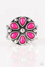 Vivacious pink beads are pressed into a studded silver frame, creating a colorful floral centerpiece atop the finger. Features a stretchy band for a flexible fit.