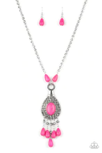A hot pink oval stone sits center stage surrounded by swirly designs stamped into a wide silver frame. A fringe of silver floral beads culminating in hot pink stones swings like a pendulum at the end of a lengthened silver chain for a fashionable finish. Features an adjustable clasp closure.