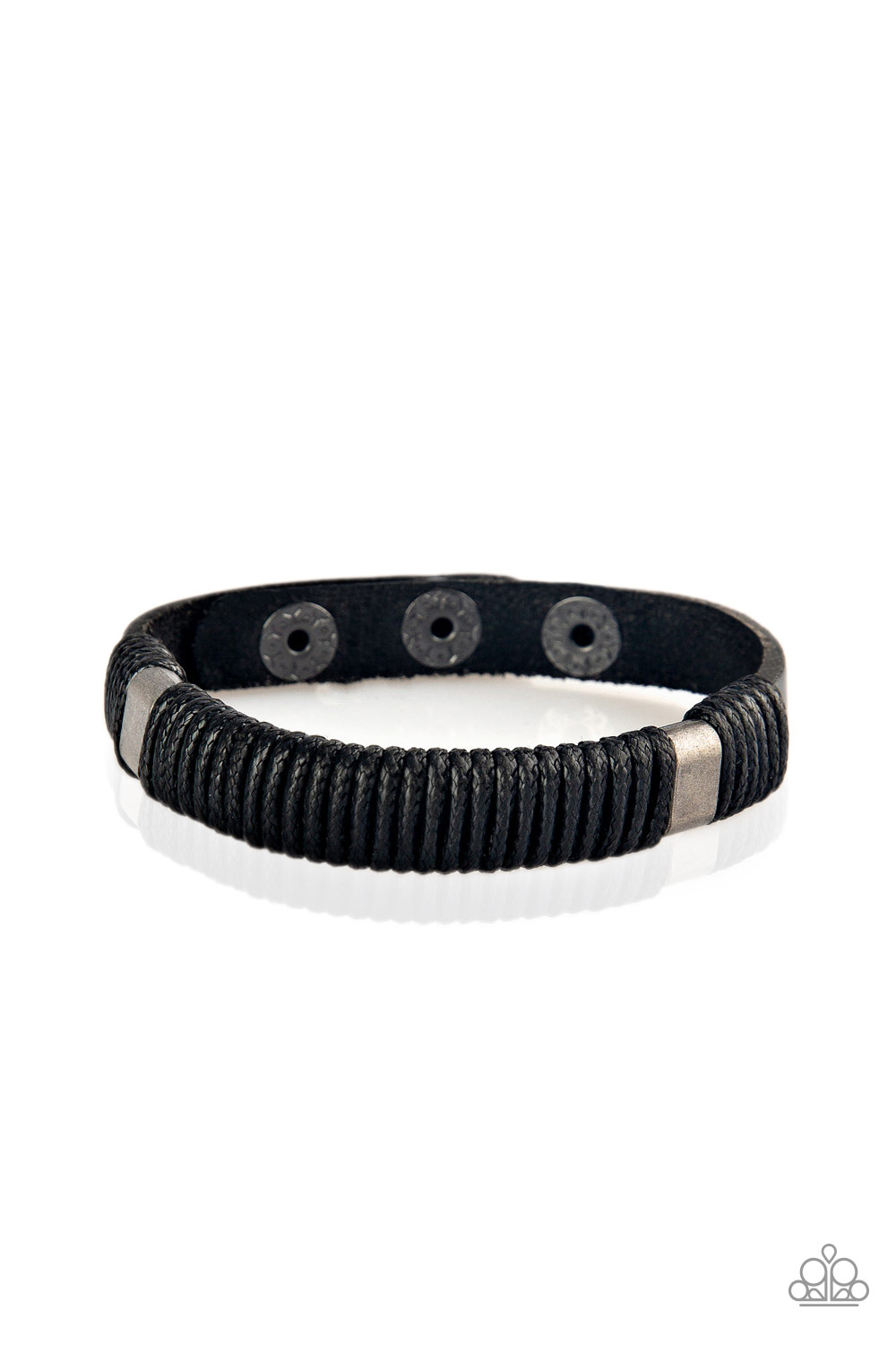 Infused with metallic accents, shiny black cording wraps around a black leather band for an urban look. Features an adjustable snap closure.