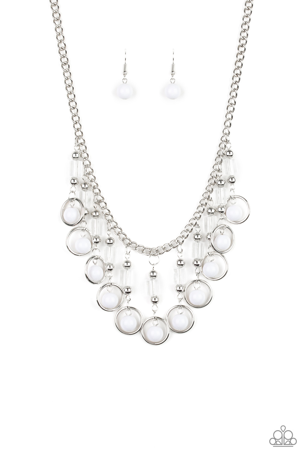 Threaded through metallic rods, a fringe of silver, white, and crystal-like beads swing from the bottom of a shimmery silver chain. Infused with dainty silver rings, the whimsically beaded tassels cascade below the collar, creating a vivacious fringe. Features an adjustable clasp closure.