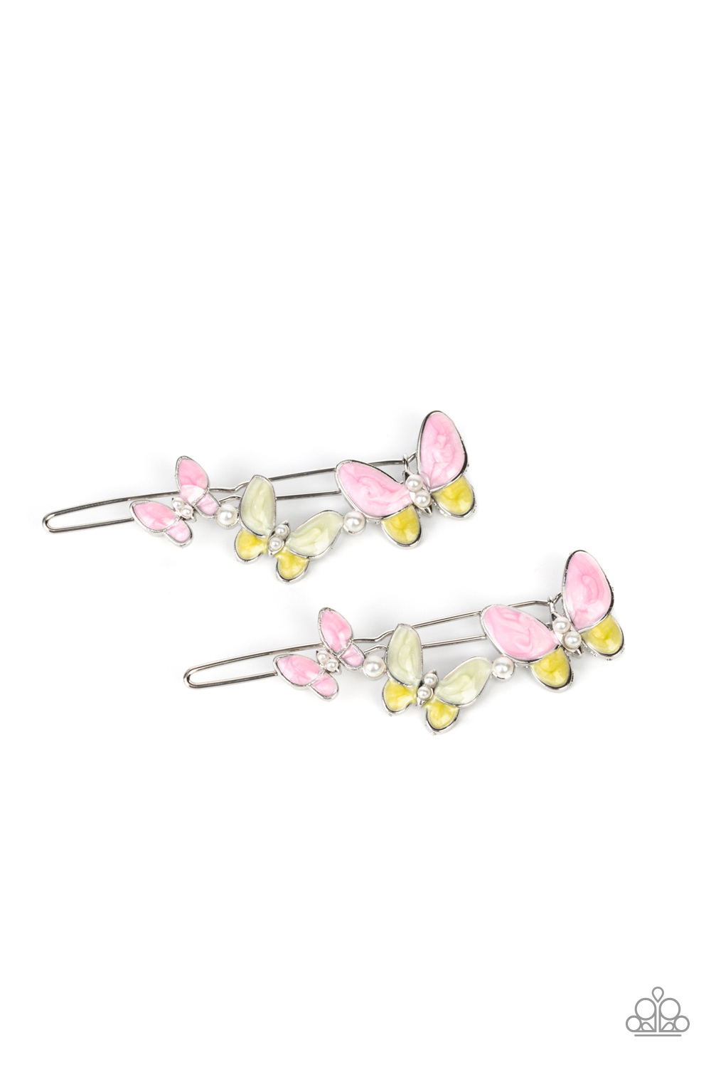 Accented with dainty pearl beads, a kaleidoscope of brightly painted pink butterflies flutter across the top of a silver clip. Features a standard hair clip on the back.