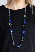 A collection of faceted, crystal-like, and sparkling blue beads join across the chest. Hammered silver rings are sprinkled between the colorful accents for a whimsical finish. Features an adjustable clasp closure.