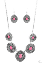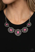 Dainty pink stones dot the centers of leafy silver filigree filled frames that delicately connect below the collar, creating a colorfully earthy look. Features an adjustable clasp closure.