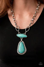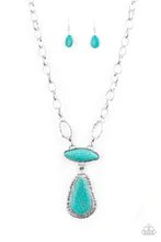 Linked by handcrafted fittings, a pair of imperfect turquoise stones are pressed into asymmetrical hammered silver frames as they stack below the collar. Oversized silver links and a pair of hammered links form into an artsy chain, adding an exaggerated finish to the earthy statement piece. Features an adjustable clasp closure. Sold as one individual necklace. Includes one pair of matching earrings.