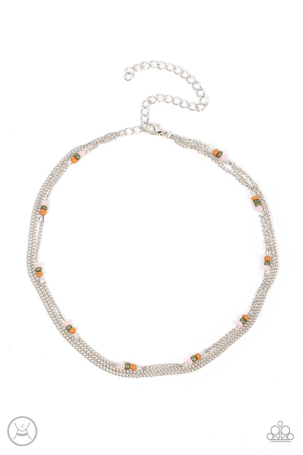 Infused with a pair of dainty silver chains, a single chain is adorned in sections of Olive Branch, Pale Rosette, and Adobe seed beads as it layers around the neck for an earthy flair. Features an adjustable clasp closure.