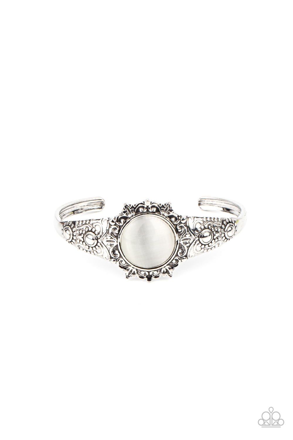 A mystical white cat's eye stone is pressed into the floral center of a dainty silver cuff that is abloom with flowery details, creating an enchanting pop of color around the wrist.