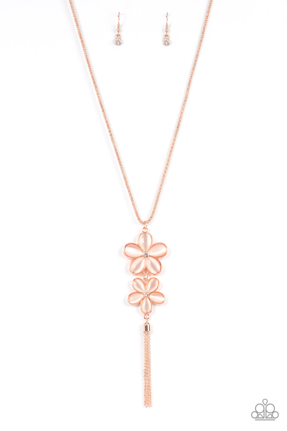 Dotted with dainty white rhinestone centers, a pair of peach cat's eye petaled flowers swing from the bottom of an extended rose gold popcorn chain. A rose gold chain tassel swings from the bottom of the enchanting display, adding playful movement to the floral centerpiece. Features an adjustable clasp closure.