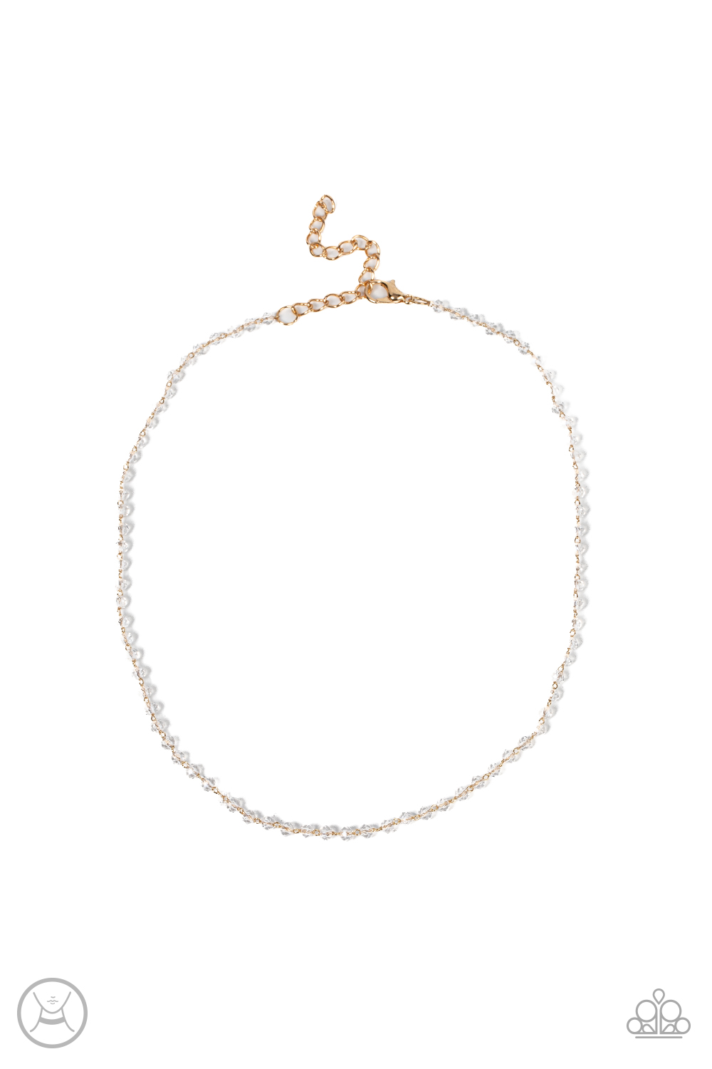 A dainty row of faceted white crystal-like beads delicately links around the neck, resulting in a golden glimmer. Features an adjustable clasp closure.