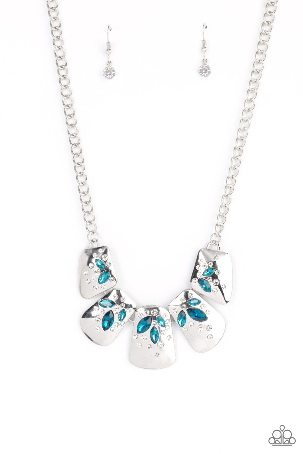 Dotted with glassy white rhinestones, curved silver plates are encrusted in glittery blue marquise cut rhinestones below the collar, resulting in a jubilant centerpiece. Features an adjustable clasp closure.
