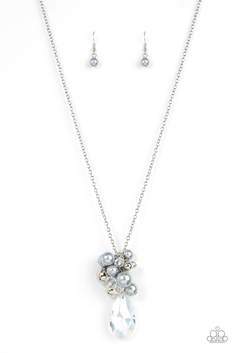 Featuring an iridescent shimmer, a dramatically oversized crystal-like teardrop swings from the bottom of a cluster of shiny silver, pearly silver, and crystal-like beads, creating a dazzling pendant at the bottom of a lengthened silver chain. Features an adjustable clasp closure.