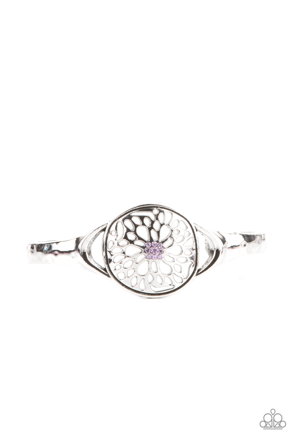 Dotted with a glassy purple rhinestone center, an airy floral frame adorns the center of a dainty silver cuff for a whimsical shine.