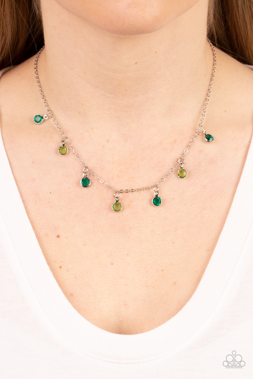 Encased in sleek silver fittings, a dainty collection of glassy green and light green gems twinkles along a dainty silver chain below the collar, creating a colorful fringe. Features an adjustable clasp closure.