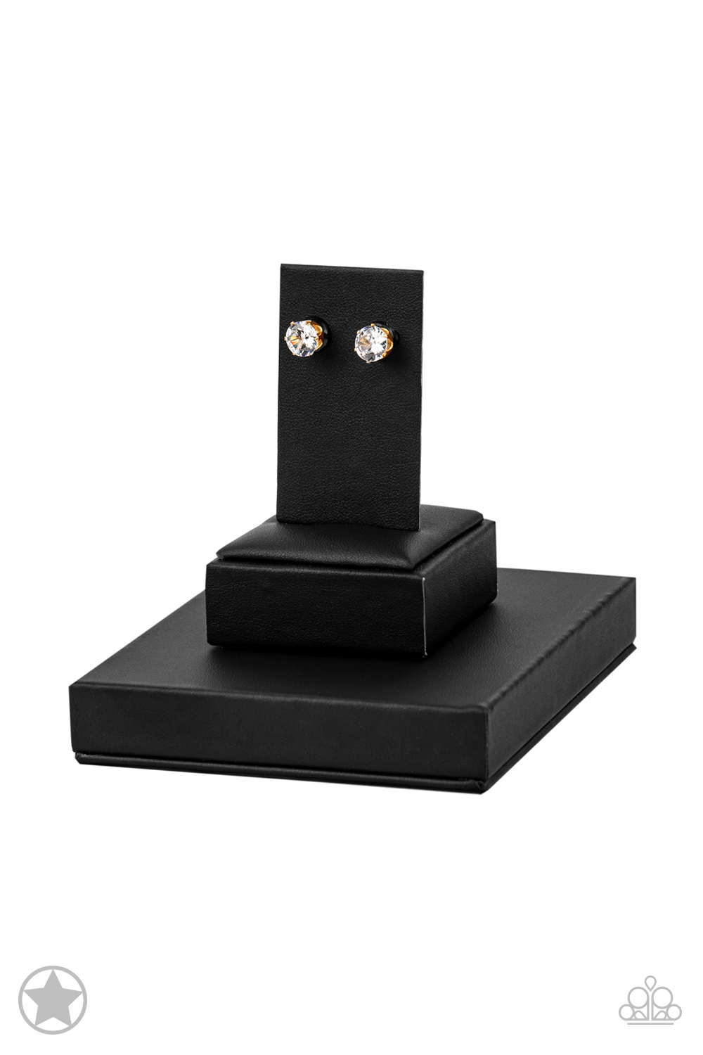 A sparkling white rhinestone is nestled inside a classic gold frame for a timeless look. Earring attaches to a standard post fitting.