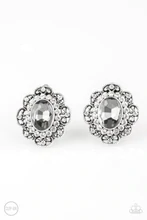 Dotted silver filigree spins into a frilly frame. A ring of radiant white rhinestones spins around a dramatic smoky gem center for a glamorous look. Earring attaches to a standard clip-on fitting. Sold as one pair of clip-on earrings.