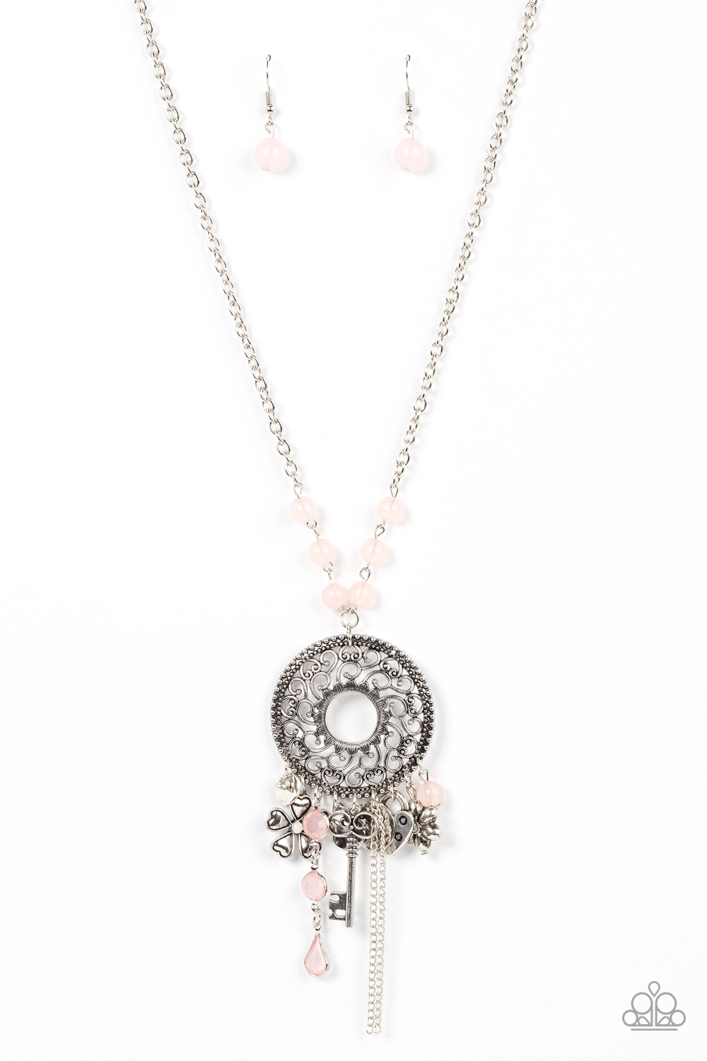 Infused with glassy Pale Rosette beaded accents, a whimsical assortment of silver key, heart, and floral charms cascades from an oversized studded silver frame that whirls with heart shaped vine-like filigree. The ornate frame swings from the bottom of a Pale Rosette beaded silver chain, adding a flirtatious pop of color to the sensational fringe. Features an adjustable clasp closure.