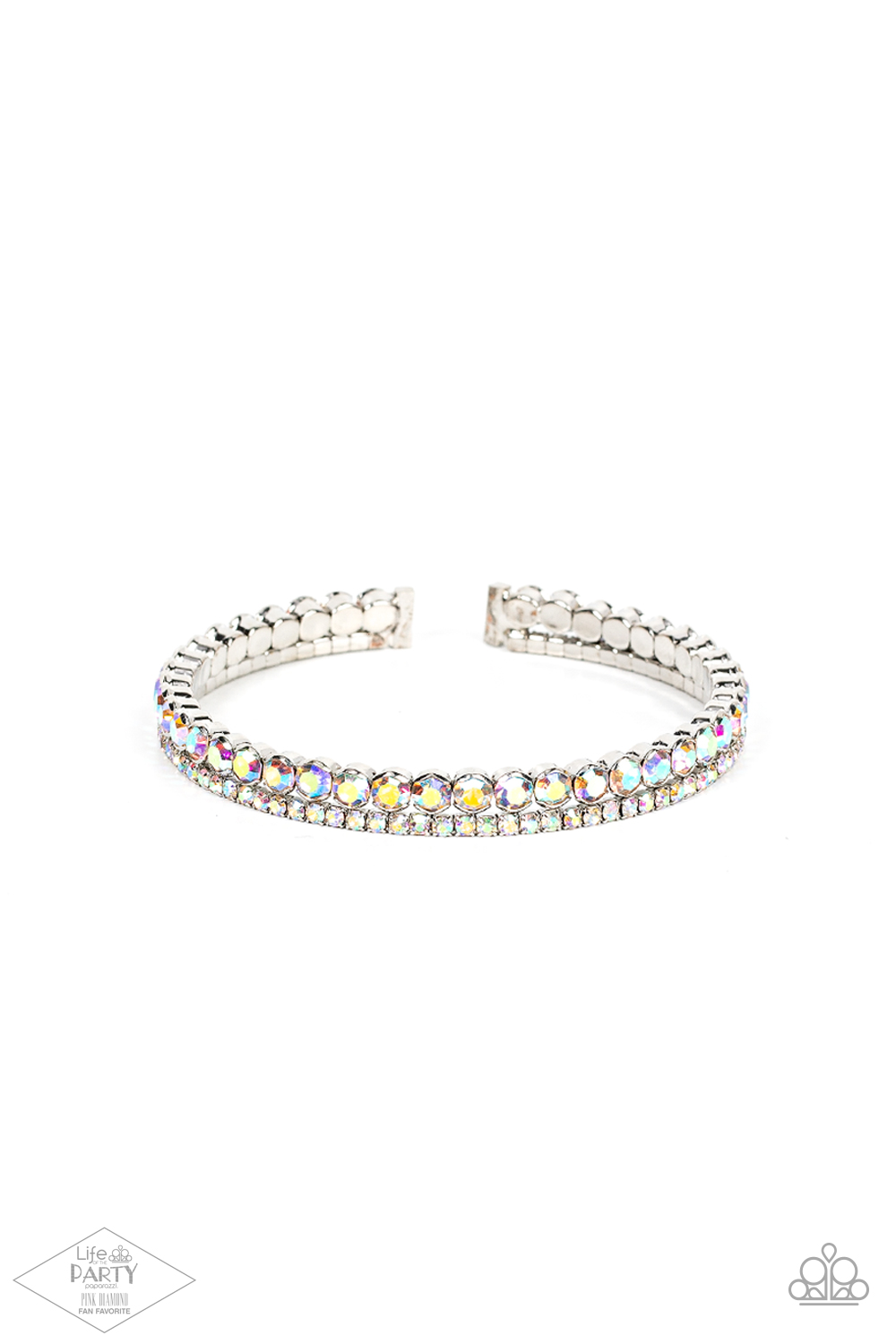 Mismatched strands of dainty and classic iridescent rhinestones stack into a delicate cuff around the wrist, creating a sparkly centerpiece.