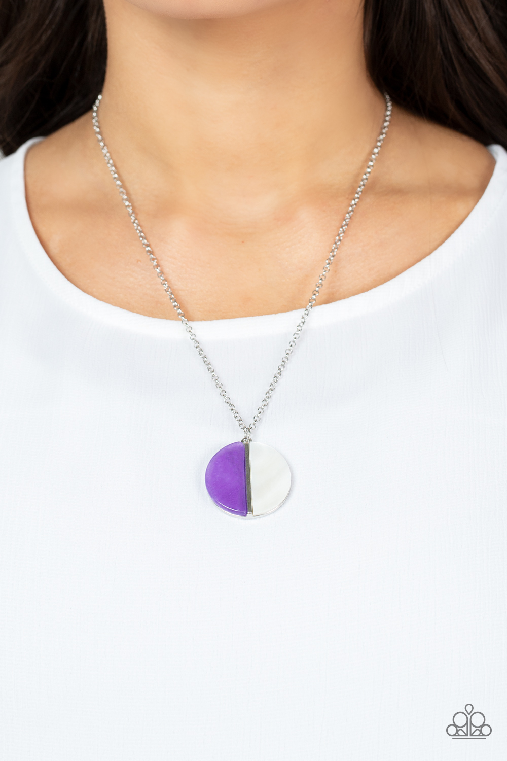A pair of amethyst stone and white shell-like half moon frames adorn the front of a round silver fitting, creating a whimsical pendant below the collar. Features an adjustable clasp closure.