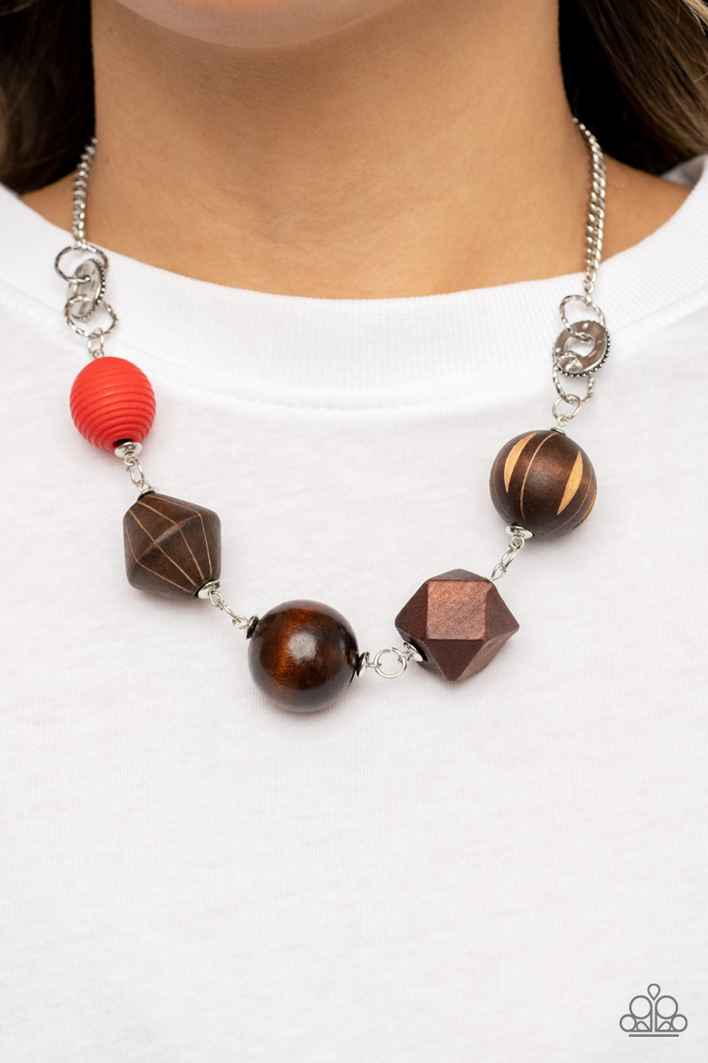 Infused with a solitaire red wooden bead, a mismatched assortment of studded silver hoops, textured silver rings, and oversized brown wooden beads delicately connect across the chest for a stylishly handcrafted fashion. Features an adjustable clasp closure.