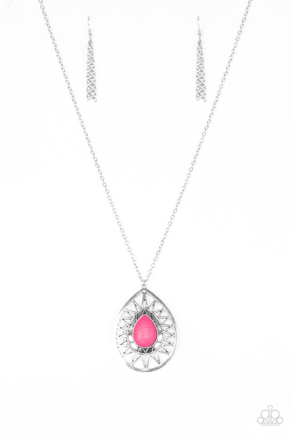 A vivacious pink stone is pressed into the center of a large silver teardrop radiating with shimmery sunburst patterns. The tribal inspired pendant swings from the bottom of a lengthened silver chain for a dramatic look. Features an adjustable clasp closure.