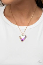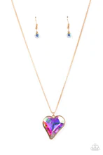 An iridescent heart-shaped gem is pressed into a simple gold frame at the end of a gold box chain creating an adorable sentiment below the collar. Features an adjustable clasp closure.