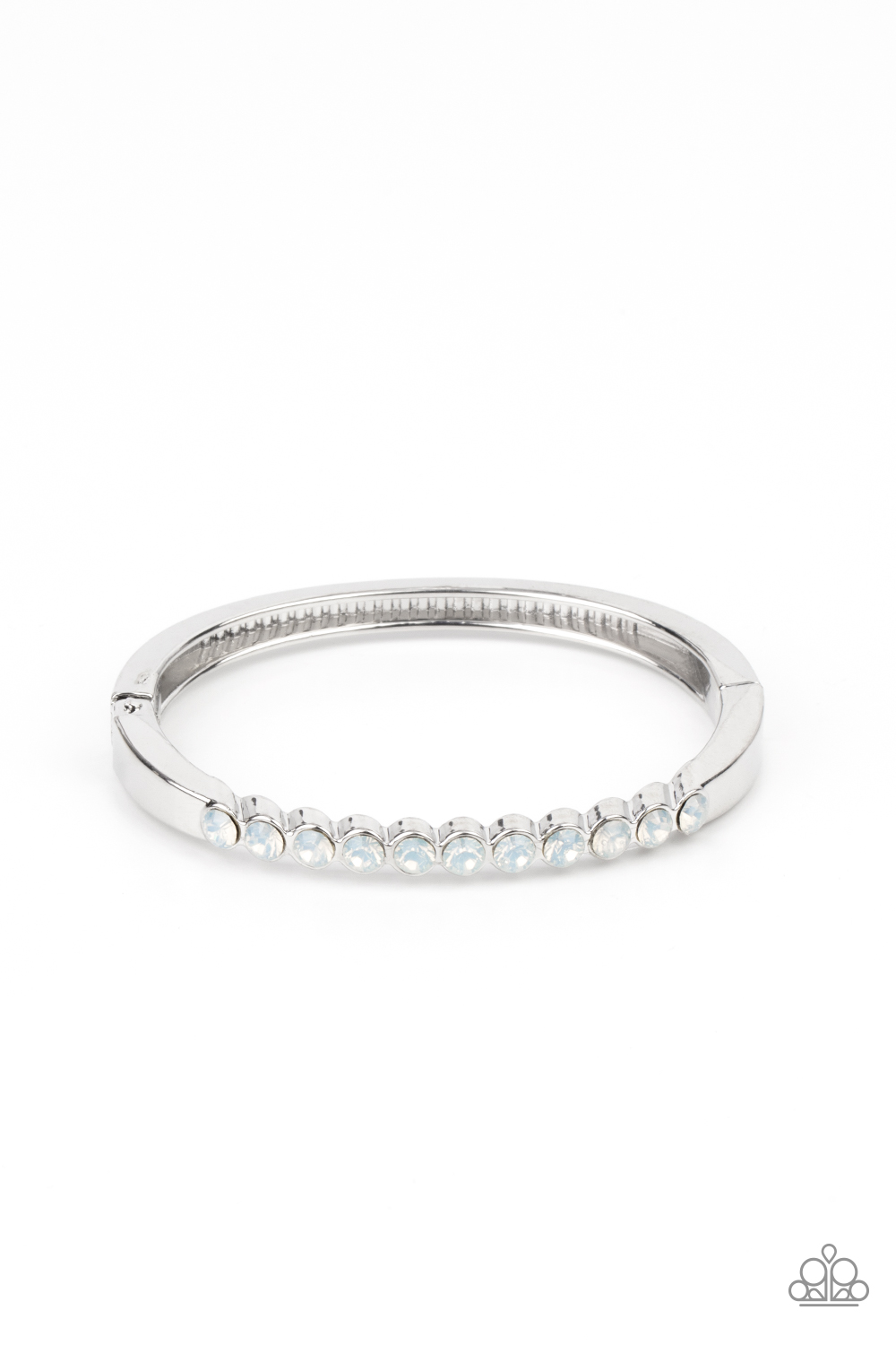 An opalescent row of white rhinestones hinges to a plain silver bar that curves around the wrist, creating a sparkly cuff-like bracelet. Features a hinged closure.