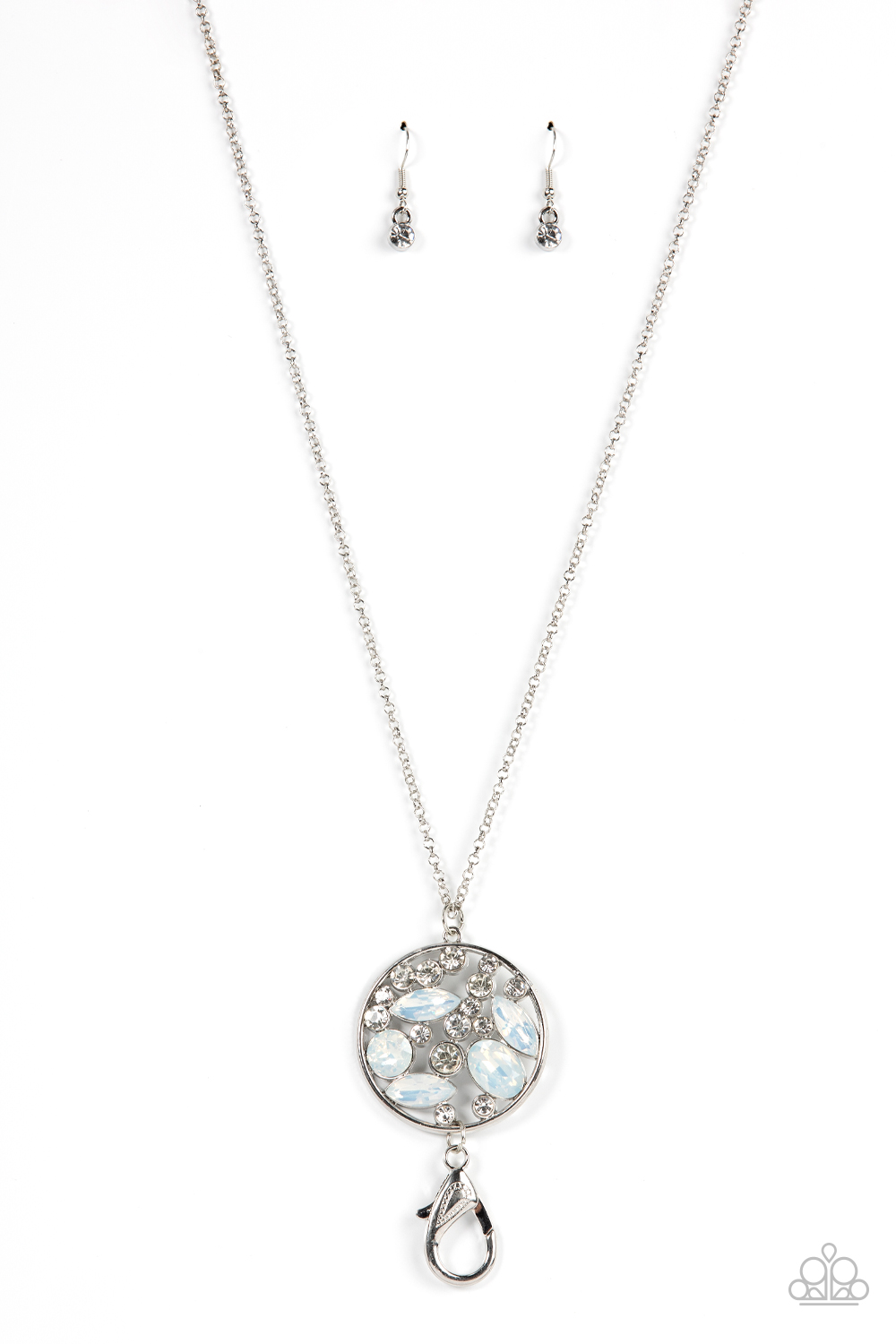 A bubbly collection of white rhinestones and round and marquise opalescent gems coalesce inside of a silver frame, creating an effervescent pendant at the bottom of a silver chain. A lobster clasp hangs from the bottom of the design to allow a name badge or other item to be attached. Features an adjustable clasp closure.