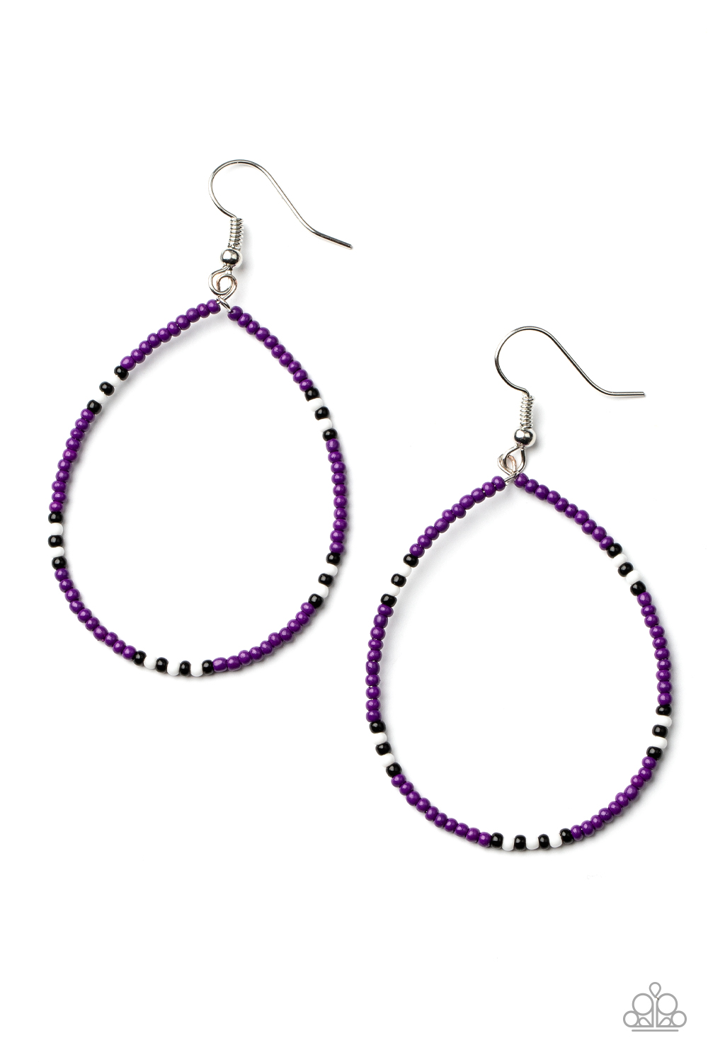 Broken up with sections of black and white seed beads, a dainty collection of purple seed beads are threaded along an invisible wire, creating a colorful teardrop. Earring attaches to a standard fishhook fitting.