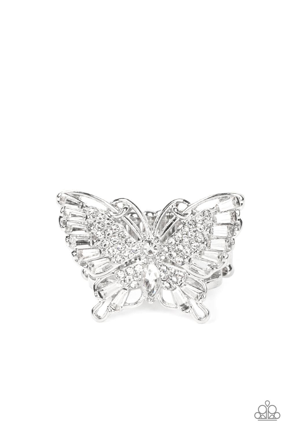 Sparkling with round, teardrop, and emerald cut white rhinestones, a silver butterfly fearlessly flutters atop the finger for a statement-making finish. Features a stretchy band for a flexible fit.