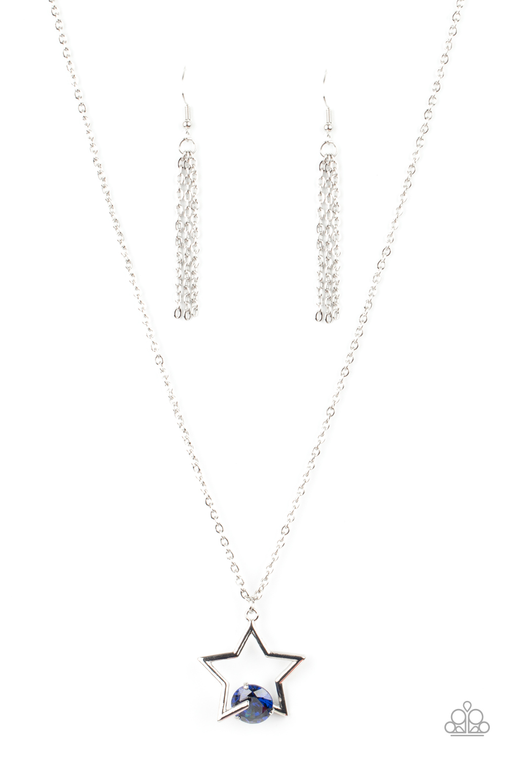 The bottom of a shiny silver star frame delicately overlaps with a dramatically oversized blue gem, creating a stellar patriotic inspired sparkle beneath the collar. Features an adjustable clasp closure.