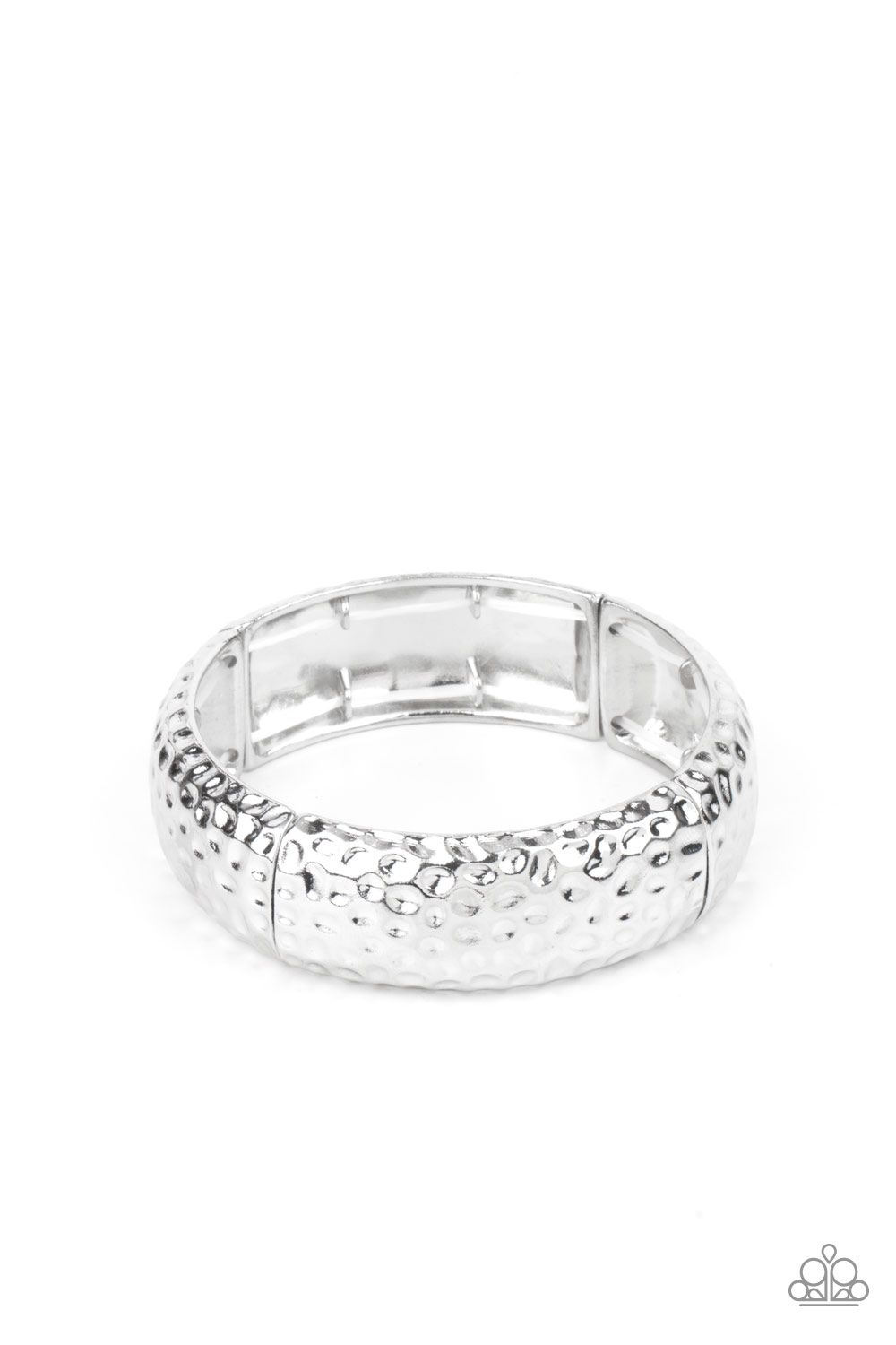 Hammered in rustic textures, curved silver rectangular frames are threaded along stretchy bands around the wrist for an artisan inspired look.