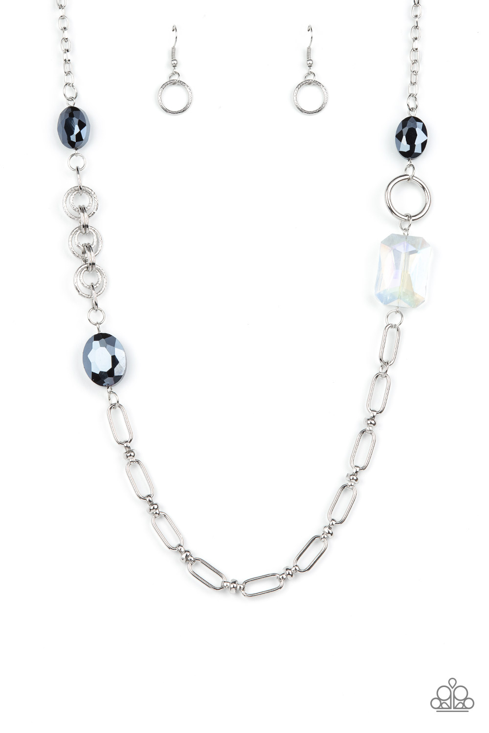 A mismatched assortment of oval, round, textured, and silver hoops haphazardly link into a chaotic chain below the collar. Featuring oval and emerald style cuts, oversized metallic blue and iridescent gems sporadically adorn the chain for a glitzy finish. Features an adjustable clasp closure.