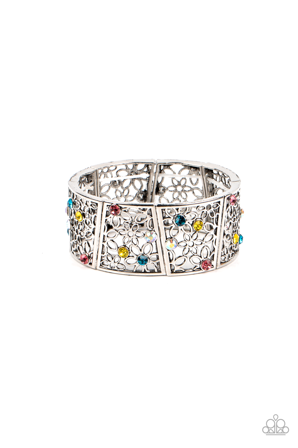 Sporadically dotted with multicolored and iridescent rhinestones, an airy daisy pattern blooms inside trapezoidal silver frames that are threaded along stretchy bands around the wrist for a seasonal statement. Due to its prismatic palette, color may vary.