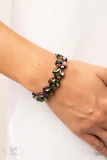 Featuring a stellar oil spill finish, trios of marquise cut rhinestones delicately join into leafy gunmetal frames along a stretchy band, creating a refined display around the wrist.