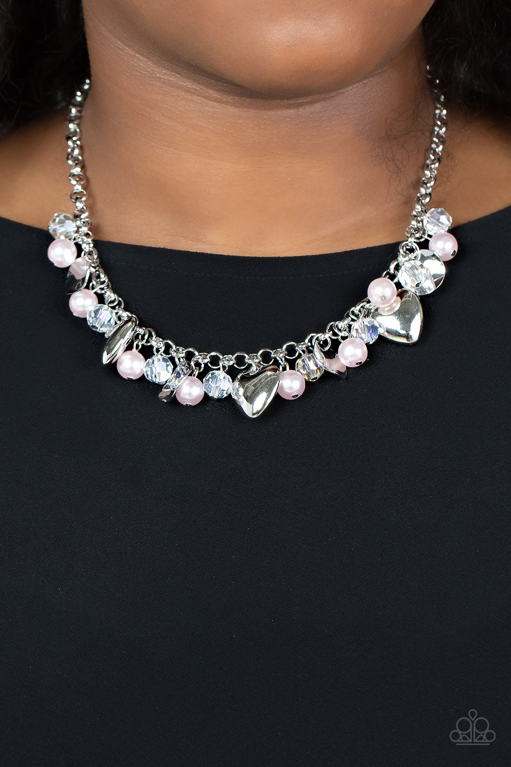 A flirtatious collection of pink pearls, glassy white crystal-like beads, crinkled silver discs, and oversized locket inspired silver heart frames dance from a shiny silver chain, resulting in a romantic fringe below the collar. Features an adjustable clasp closure.