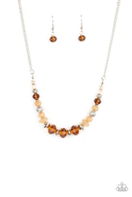 Varying in opacity, an enchanting collection of sparkly topaz, brown, and champagne colored crystal-like beads are threaded along an invisible wire that is attached to a shiny silver chain below the collar. Mismatched silver beads and ornate silver accents are sprinkled between the glittery compilation, adding a whimsy sheen to the colorful statement piece. Features an adjustable clasp closure.