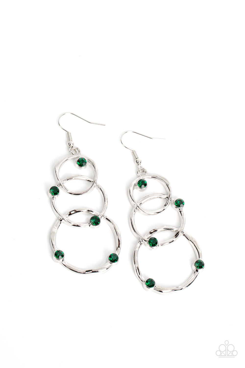 A sprinkling of glittery green rhinestones floats across a trio of wavy silver circles that graduate in size as they interlock into a glamorously luminous lure. Earring attaches to a standard fishhook fitting.