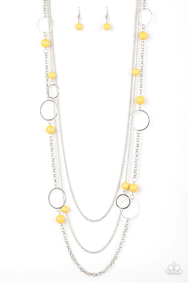 Featuring hearty yellow beads and shimmery silver hoops, mismatched silver chains layer down the chest for a seasonal look. Features an adjustable clasp closure. Sold as one individual necklace. Includes one pair of matching earrings.