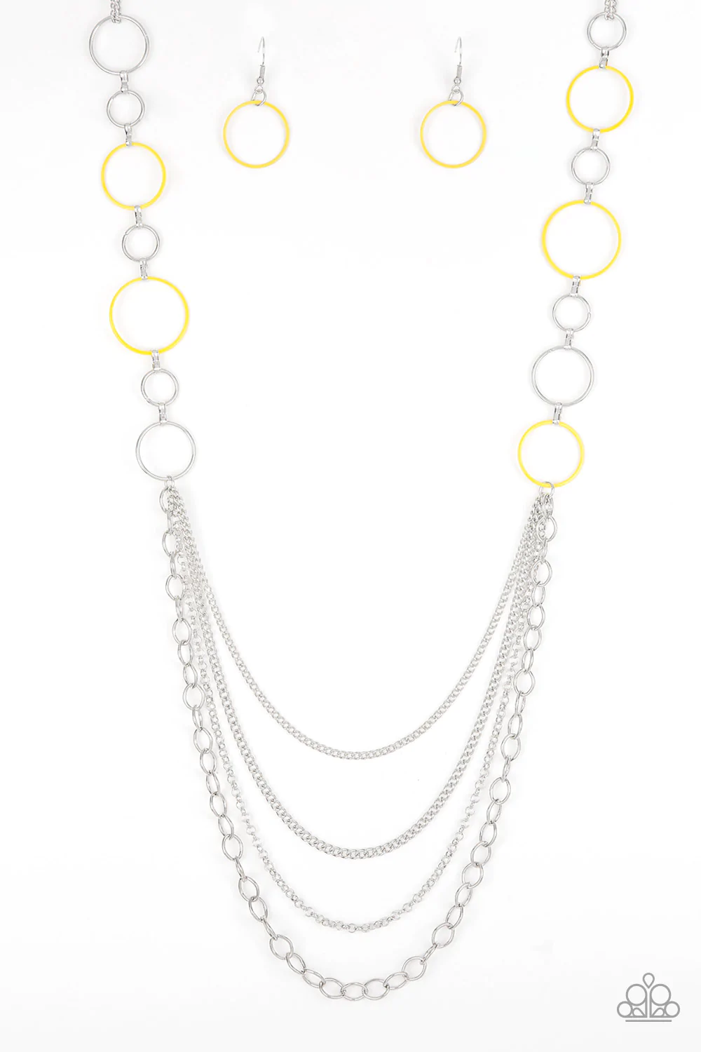 Sunny yellow and glistening silver hoops connect down the sides of the chest, giving way to a mismatched silver layers for an abstract finish. Features an adjustable clasp closure.